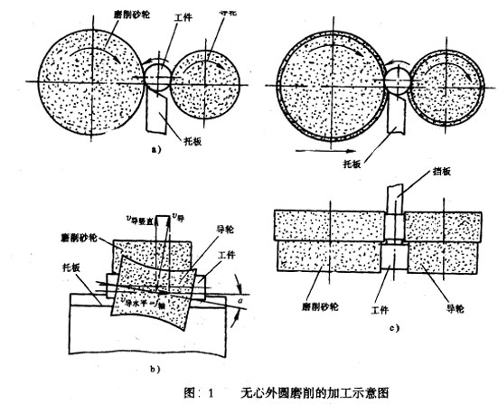 無心外圓磨床是一種特殊的外圓磨床。在無心處圓磨床上磨削工件外圓時(shí),工件不用頂尖來定心和支承,而是直接將工件放在砂輪子和導(dǎo)輪子之間,由托板支承,工件被磨削的外圓面作定位面,如圖1所示。
