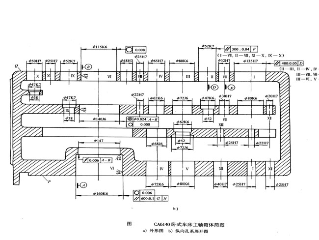 現(xiàn)以車床主軸箱箱體為例,進(jìn)一步說明這些原則的具體應(yīng)用。CA6140車床主軸箱箱體零件簡(jiǎn)圖如圖所示