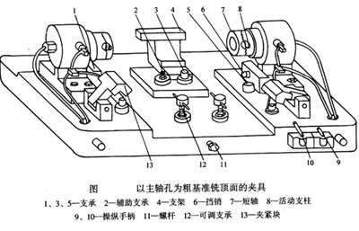 導(dǎo)向支承可以直接固定在夾具體上,夾具剛度好,有利于保證孔系加工的位置精度,且裝卸方便,便于組織生產(chǎn)流水線和實(shí)現(xiàn)情動(dòng)化生產(chǎn),適用于大批大量生產(chǎn)。但這種定位方案也有不足之外,如在加工過程中無法觀察加工情況,無法測(cè)量孔徑和調(diào)整刀具,因而要求采用定尺寸刀具直接保證孔的精度,須相應(yīng)提高頂面R至底面M的尺寸加工精度,同時(shí),兩定位銷孔,圖樣上為主軸孔的沒孔,其精度不高,也提高加工精度。