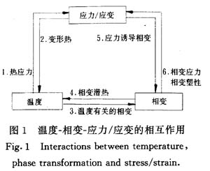 鋼在淬火過程中存在極為復雜的溫度、相變、應力/應變相互作用,在此方面已有許多報道[1]。如圖1所示,在淬火過程中,溫度造成熱應力并影響材料的力學參數(shù)(彈性模量、泊松比、屈服強度和應變硬化率等),從而影響材料的力學行為。應力/應變則以變形熱的形式反過來影響溫度的變化。隨著溫度的降低,在達到相變條件后將發(fā)生相變。溫度是決定相變的因素之一,但其本身又受著相變潛熱的影響。內(nèi)應力的存在,可通過一種通常稱為應力誘導相變的機制而影響相變的進程。在相變過程中,各組成相的比容差異將造成相變應力,同時由于材料的絕大多數(shù)參數(shù)除了依賴于溫度實際上也依賴于相態(tài),因此,相變也會對材料的力學行為產(chǎn)生影響。此外,在有內(nèi)應力存在時相變過程中還會伴隨一種“反!钡乃苄孕袨椋床牧显趹Φ陀谇䦶姸鹊那闆r下就可以發(fā)生不可逆變形的現(xiàn)象,稱為相變塑性。