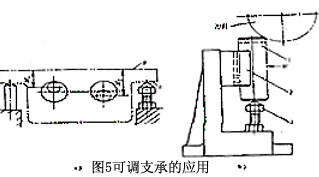 可調(diào)支承主要用于工件以粗基準(zhǔn)面定位、或定位基面的形狀復(fù)雜(如成型面、臺階面等),以及各批毛壞的尺寸、形狀變化較大時的情況。如圖5a所示工件,毛坯為砂型鑄件,先以A面定位銑B面,再以B面定位鏜雙孔。銑B面時,若采用固定支承,由于定位基面A的尺寸和形狀誤差較大,銑完后,B面與兩毛坯孔(圖中虛線)的距離尺寸H1、H2變化也大,致使鏜孔時余量很不均勻,甚至余量不夠。因此,將固定支承改為可調(diào)支承,再根據(jù)每批毛坯的實(shí)際誤差大小 調(diào)整支承釘?shù)母叨,就可避免上述情況。圖5b為利用可調(diào)支承加工不同尺寸的相似工可調(diào)支承在一批工件加前調(diào)整一次。在同一批工件加工中,它的作用與固定支承相同。