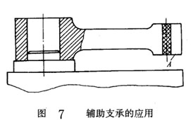 如圖7所示,工件以內(nèi)孔及端面定位,鉆左端小孔。由于左端為一懸臂,鉆也時工件剛性差。若在A 處設(shè)置固定支承,屬過定位,有可能破壞左端的定位。這時可在A 處調(diào)協(xié)一輔助支承,承受眳削力,既不破壞定位,又增加了工件的剛性。