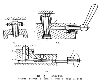 圖8為夾具中的三種輔助支承。圖a為螺旋式輔助支承。圖b為自位式輔助支承,滑柱1在彈簧2的作用下與工件接觸,轉(zhuǎn)動手柄使項(xiàng)柱3將滑柱鎖緊。圖c為推引式輔助支承,工件夾緊后轉(zhuǎn)動手輪4使斜楔6左移將滑銷5與工件接觸。繼續(xù)轉(zhuǎn)動手輪可使斜楔的6的開槽部分漲開面緊鎖。