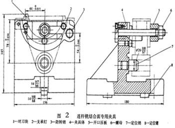 (1) 連桿銑給合面專用夾具,如圖2所示,工件以底面及φ20H8孔在三個支承釘2及定位銷7上定位,防轉(zhuǎn)銷3限制工件轉(zhuǎn)動。擰緊螺母6,通過開口壓板5夾緊工件。