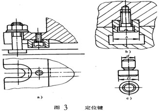 定位鍵有矩形和圓形兩種,圓形定位鍵(如圖4C所示)補(bǔ)償貿(mào)易加工,便較易磨損,故用得不多。矩形定位鍵有兩種結(jié)構(gòu)形式,一種在鍵的側(cè)面開有溝槽或臺附(圖4b),把鍵分為上、下兩部分,其上部按H7/h6與夾具體底面上的槽或臺附。下部與多才多藝床工作臺上的T形槽配合。因工作臺T形槽的公差為H8或H7,故尺寸b按h8或h6制造,以減少配合間隙,提高定向精度。另一種鍵為矩形(圖4)上下兩部分尺寸相同,它適用于定向烳工度要求不高的夾具。