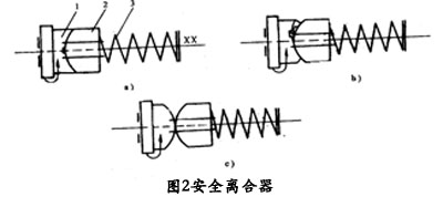 機床過載時,蝸桿ⅩⅩ上的阻力矩加大,安全離合器傳遞的轉(zhuǎn)矩也加大,因而作用在螺旋形端面齒上的軸向力也加大,當軸向力超過規(guī)定值時,軸向力將超過彈簧3的彈性力,彈簧不再保持離合器左、右兩半相嚙合,于是軸向力便將離合右半部推開。見圖2b,這時離合器左半間1繼續(xù)旋轉(zhuǎn),而離合器右間部卻不能被帶動,所以在兩者之間產(chǎn)生打滑現(xiàn)象,見圖2c,使傳動鏈斷開,于是保護了傳動機構(gòu),使它們不致因過載而損壞。當過載現(xiàn)象排除后由于彈簧3的彈力 ,安全離合器恢復嚙合,重新正常工作。