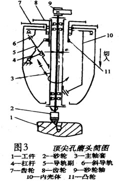用頂尖孔磨床磨削頂尖孔,如力3所示的頂尖孔磨床,為立式磨床,下面有頂尖撥盤可以帶動工件轉(zhuǎn)動,工件上端支承在由兩小圓柱組成的V形體上,與工件圓柱或圓錐面成線接觸。磨頭有三個運動:1主切削運動,由砂輪軸9帶動砂輪高帶旋轉(zhuǎn);2行星運動,齒輪7帶動砂輪軸9作以e為貪偏心量的行星運動;3往復(fù)運動,齒輪7與內(nèi)殼體10及斜導(dǎo)軌6成為一體,由徑向及推力軸承支承作回轉(zhuǎn)運動,齒輪8帶動凸輪子11 轉(zhuǎn)動,并推動杠桿4,帶動斜導(dǎo)軌副5沿斜導(dǎo)軌作30度往復(fù)滑動,,克用因砂輪各點線速度不同造成的誤差。該機床加工精度為圓度0.8ium,,表面粗糙度值為Ra0.32.