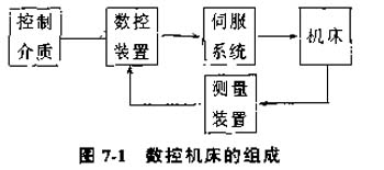 (1)數(shù)控機床的組成,數(shù)控機床一般由控制介質、數(shù)控裝置、伺服系統(tǒng)和機床成本體組成。圖7-1的實線所示為開環(huán)控制的數(shù)控機床框圖。