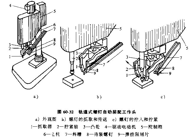 2)軌道式螺紋自動(dòng)裝配工作頭,這種工作頭的待裝螺釘在軌道中運(yùn)動(dòng)。圖60-32為一種能實(shí)現(xiàn)螺釘自動(dòng)傳送、抓取、對(duì)準(zhǔn)、擰入和擰緊等一系列作業(yè)的工作頭。工作頭的工作過程為: