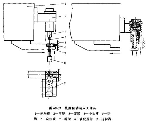 圖60-33為一種墊圈自動(dòng)裝入工作頭。墊圈5作為裝配由送料器9水平送入,呀靠滑架7和中心桿4定位。隨后滑座2下行,中心桿4插入墊圈孔內(nèi)。同時(shí),裝配基準(zhǔn)件8上升與中心桿4結(jié)合;7隨即退回。然后套筒3下行,用機(jī)動(dòng)推入方式完成墊圈5與裝配基準(zhǔn)件8的自動(dòng)裝配作業(yè)。