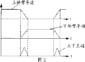 在小車動作的過程中,我們要不斷 地使電機(jī)在四個(gè)象限之間切換,即在正 轉(zhuǎn)和反轉(zhuǎn)之間切換,也就是在S1、S2導(dǎo)通且S3、S4關(guān)斷,到S1、S2關(guān)斷且S3、 S4導(dǎo)通,這兩種狀態(tài)之間轉(zhuǎn)換。在這種 情況下,理論上要求兩組控制信號完全互補(bǔ),但是,由于實(shí)際的開關(guān)器件都存在 開通和關(guān)斷時(shí)間,絕對的互補(bǔ)控制邏輯 必然導(dǎo)致上下橋臂直通短路,比如在上橋臂關(guān)斷的過程中,下橋臂導(dǎo)通了。這個(gè)過程可用圖2說明。