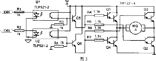 由于電機(jī)在正常工作時(shí)對電源的干擾很大,如果只用一組電源時(shí)會影響單片機(jī)的正常工作,所以我們選用雙電源供電。一組5V給單片機(jī)和控制電路供電,另外一組9V給電機(jī)供電。在控制部分和電機(jī)驅(qū)動部分之間用光耦隔開,以免影響控制部分電源的品質(zhì),并在達(dá)林頓管的基極加三極管驅(qū)動,可以給達(dá)林頓管提供足夠大的基極電流。圖3所示為采用TIP122的驅(qū)動電機(jī)電路,IOB8口為“0”,IOB9口輸入PWM波時(shí),電機(jī)正轉(zhuǎn),通過改變PWM的占空比可以調(diào)節(jié)電機(jī)的速度。而當(dāng)IOB9口為“0”,IOB8口輸入PWM 波時(shí),電機(jī)反轉(zhuǎn),同樣通過改變PWM的占空比來調(diào)節(jié)電機(jī)的速度。