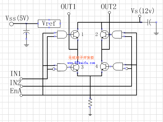 另一個H橋的工作原理同上。由EnB控制OUT3和OUT4之間電機的停轉,根據(jù)IN3、IN4腳的輸入電平情況控制OUT3和OUT4之間電機的轉向。