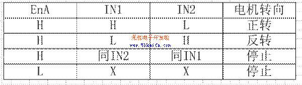 為提高系統(tǒng)效率、降低功耗,功放驅動電路采用基于雙極型H橋型脈寬調制方式(PWM)的集成電路L298N。L298N是SGS公司的產品,內部包含二個H橋的高電壓大電流橋式驅動器,接收標準TTL邏輯電平信號,可驅動46伏、2安培以下的電機,工作溫度范圍從-25度到130度。其內部的一個H橋原理圖如圖1所示。EnA是控制使能端,控制OUTl和OUT2之間電機的停轉, IN1、IN2腳接入控制電平,控制OUTl和OUT2之間電機的轉向。當使能端EnA有效,IN1為低電平IN2為高電平時,三極管2,3導通,1,4截止,電機反轉。當IN1和IN2電平相同時,電機停轉。表1是其使能引腳,輸入引腳和輸出引腳之間的邏輯關系。
