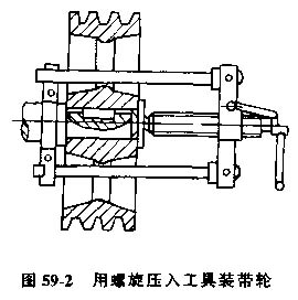 A) 圓錐軸頸,擋圓軸向固定,b)軸肩、擋圓軸向固定,c)楔鍵周向、軸向固定,d)隔套、擋圈軸向固定安裝帶輪前,先按軸的軸轂孔的鍵槽修配鍵,然后清理安裝面并涂上潤(rùn)滑油。用木錘或銅棒將帶輪輕打到軸上,或用螺旋等壓入工具將帶輪壓到軸上,見(jiàn)圖59-2。