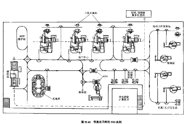 (2)帶流動刀庫的FMS(見圖52-61)此系統(tǒng)的特點之一是,系統(tǒng)內(nèi)設(shè)有可更換的流動刀庫,流動刀庫根據(jù)加工的需要在其裝卸站配備刀具,由小車AGV運(yùn)送并暫存在流動刀庫緩存站,加工需要時送到機(jī)床邊的刀具交換站,與機(jī)床刀庫中的刀具更換。