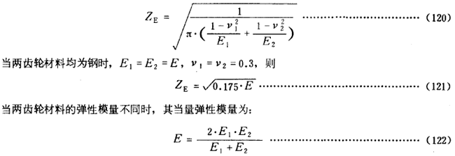 彈性系數(shù)ZE是用以考慮材料彈性模量E泊桑比v對赫茲應(yīng)力的影響。其數(shù)值可按實(shí)際的材料彈性模量E和泊桑比v由式(120)計(jì)算得出。對于某些常用材料組合的ZE可參考表14查取。