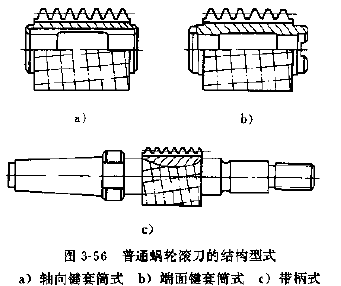 1.結(jié)構(gòu)型式,蝸輪滾刀的結(jié)構(gòu)型式分為套筒式和帶柄式兩種,見圖3-56,m7普通蝸輪滾刀。