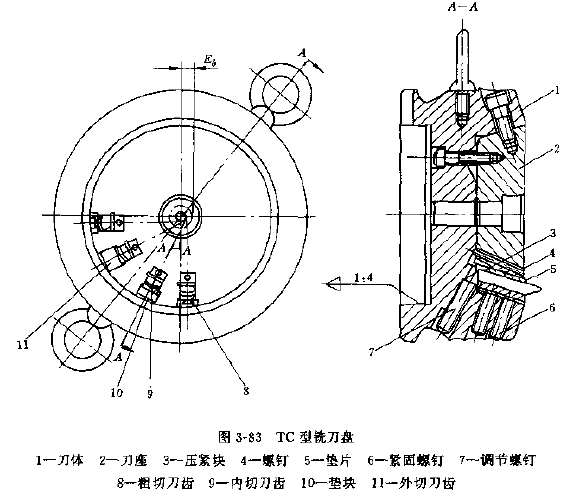 標(biāo)準(zhǔn)刀盤(pán)適用于成批和大量生產(chǎn)。較舊的標(biāo)準(zhǔn)刀盤(pán)是TC型刀盤(pán),其公稱(chēng)切線半徑39~125mm,用來(lái)切削法向摩樹(shù)2.1~8.5mm、外錐距55~250mm。當(dāng)量齒數(shù)24~75的普通延伸外擺線齒錐齒輪和小偏位的準(zhǔn)雙曲面齒輪。著種刀盤(pán)的結(jié)構(gòu)型式見(jiàn)圖3-83。TC型銑刀盤(pán)有不少缺點(diǎn),已被結(jié)構(gòu)較新的EN型銑刀盤(pán)和其他刀盤(pán)所代替。