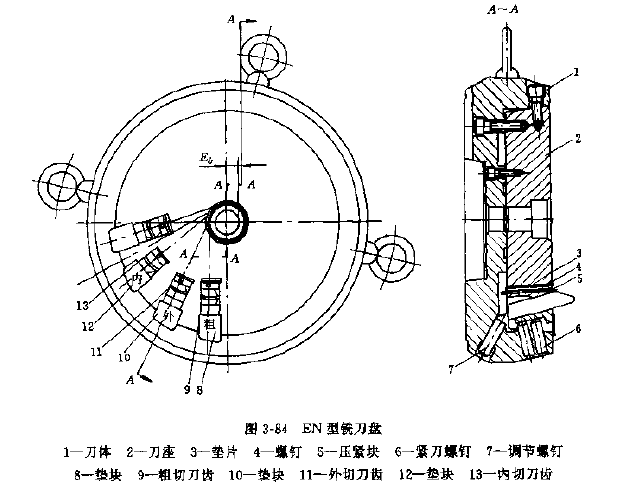 EN型銑刀盤(pán)與TC型銑刀盤(pán)的結(jié)構(gòu)大致相同,但其切削方向相反,有利于工件的定位夾緊;刀齒的排列次序也是粗切刀齒在前,但其位于最小半徑上,因而減小了扭矩和粗切速度。有可能采用較高的切削用量,以160mm、用來(lái)切削法向模數(shù)2.1~11.8mm的延伸外擺線齒錐齒輪。EN銑刀盤(pán)的結(jié)構(gòu)型式和基本尺寸見(jiàn)圖3-84和表3-171。