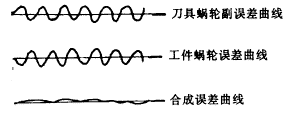 2. 周期誤差抵消,如果測(cè)出插齒機(jī)兩套蝸輪副的周期誤差(即蝸桿誤差)大,而兩套蝸輪的齒數(shù)zfc和zf又不相同,這時(shí)可選定z/zc=zf/zfc,使得兩套蝸桿的周期變得相同,再配合儀器調(diào)整其相位相反后固定。這樣,在以后的運(yùn)動(dòng)過程中蝸輪副的周期誤差值將被抵消絕大部分(圖4)。