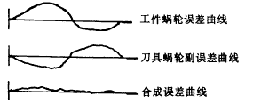 1. 累積誤差抵消。如果測(cè)出插齒機(jī)兩套蝸輪副的累積誤差是影響工件質(zhì)量的首要因素,可選用zc和z相等即z/zc=1,傳動(dòng)比等于1,使兩套蝸輪副的周期變得相同。再不斷對(duì)其中一套蝸輪進(jìn)行轉(zhuǎn)位,邊轉(zhuǎn)位邊測(cè)試曲線,直到其誤差曲線的相位變得和另一套蝸輪相反(相差180o)后固定。這樣,兩套蝸輪的累積誤差在以后的工作過程中將大部分抵消(圖3)。