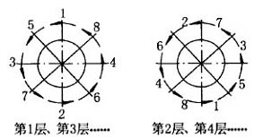 2 焊前準(zhǔn)備 (1)焊前轉(zhuǎn)軸表面應(yīng)仔細(xì)清理,嚴(yán)格清除一切會(huì)產(chǎn)生氫氣的油類等雜質(zhì)。 (2)選用J857 焊條,φ3. 2mm。焊前將焊條在爐中250~300℃烘干2h,隨用隨取,消除焊條中的水分。 (3)在直流電焊機(jī)上采用反接法。3 焊補(bǔ)工藝 (1)將整個(gè)轉(zhuǎn)軸放進(jìn)烘爐預(yù)熱到300℃后取出! (2)將轉(zhuǎn)軸吊到滾輪支架上,滾輪應(yīng)支承于軸上φ135及φ140兩外圓處,裝上扳轉(zhuǎn)卡箍。 (3)采用對(duì)稱交錯(cuò)焊補(bǔ),每圈分8段,每層接頭收尾均應(yīng)錯(cuò)開, 填滿弧坑, 電流值取90A~100A,慢焊速,以防止轉(zhuǎn)軸過(guò)熱,減小熔深和熱影響區(qū)。采用連續(xù)施焊,焊縫寬度應(yīng)大于6mm,高出轉(zhuǎn)軸表面2mm,第1層和第2層的焊接次序見圖2所示,第3層次序與第1層相同,第4層與第2層相同,其余類推。