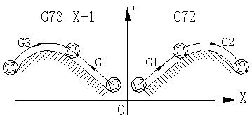 在數(shù)控加工程序代碼中,有個鏡像加工的指令。比如某型號加工中心的鏡像加工指令為G73(示意圖如圖1所示),其中設(shè)原加工圖形為第一象限的G72,使用G73 X-1指令后就可以加工出第二象限所示的圖形。也就是說將原程序段的加工代碼按Y軸或X軸(或XY混合)做軸向鏡像,當要加工鏡像體時不需要另外編制程序,只需要將原程序代碼加以鏡像即可。