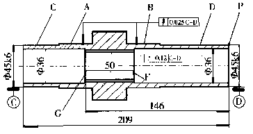 以軸套內(nèi)花鍵大徑為基準,用花鍵錐度芯軸大徑定位測量A、B、C、D各段外圓徑向跳動,用裝夾兩次的測量結(jié)果來判定軸套各段外圓徑向跳動是否合格,規(guī)定一次裝夾和二次裝夾的測量結(jié)果都不允許超差。
