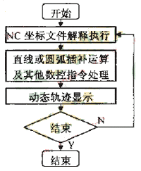 刀具軌跡動態(tài)仿真是根據(jù)要進行仿真的數(shù)控代碼,在計算機屏幕上動態(tài)顯示刀具軌跡,以運動軌跡的方式來直觀顯示零件具體的加工過程;進行刀具軌跡動態(tài)仿真時,順序讀入NC坐標信息文件,獲取數(shù)控指令(直線、圓弧指令等)和命令參數(shù)(起點、終點和圓心坐標等),然后執(zhí)行相應的軌跡處理:對于直線和圓弧命令,則要根據(jù)其起止運動坐標,進行直線和圓弧的插補運算,得到運動過程中離散的中間點的坐標值,然后動態(tài)顯示刀具運動軌跡。刀具運動軌跡仿真算法流程如圖2所示。