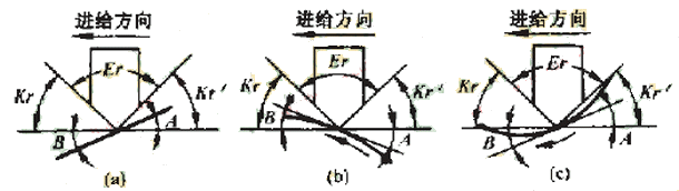 具體的干涉碰撞檢查算法,是在插值點將加工刀具的主偏角和副偏角與直線傾斜角度比較,對于圓弧段輪廓,則與該插值點在圓弧輪廓的切線的傾斜角進行比較,并區(qū)分順圓和逆圓兩種情況。以右車刀切外輪廓為例,其對于直線和圓弧的干涉檢查如圖4所示。檢查結(jié)果將寫入一個干涉報告中,圖4中,kr為主偏角.kr'為副偏角,Er為刀尖角,A為與切削加工方向相反的傾斜角,B為與切削加工方向相同的傾斜角。當A>kr時,刀具副切削刃和零件表面發(fā)生干涉,當180°+B<180°-kr時,刀具的主切削刃和零件表面發(fā)生干涉,這時將發(fā)生過切現(xiàn)象二對于不同的加工方向和加工輪廓,上述判別式應進行相應的調(diào)整。