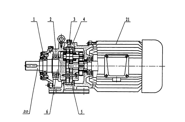 | 一種減速機(jī),電機(jī)(21)與針齒殼(4)聯(lián)接,針齒殼(4)與機(jī)座(2)聯(lián)接,其特征在于,空心行星架裝置(6)通過軸承設(shè)于機(jī)座(2)內(nèi),并與裝在針齒殼(4)內(nèi)的針齒銷(3)、擺線片(5)產(chǎn)生關(guān)聯(lián),太陽輪(13)與電機(jī)(21)的電機(jī)軸(12)連接,輸出軸(20)和空心行星架(6)整合為一體延伸至機(jī)座(2)外。 |