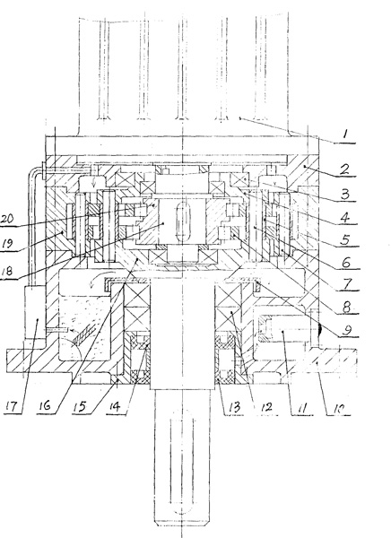 | 一種釜用不泄漏減速機(jī),由擺線輪[8]、輸入軸[18]、偏心軸承[20]、機(jī)座[10]、針齒輪及W輸出機(jī)構(gòu)組成,其中針齒輪由針齒殼[19],均布在針齒殼上的針齒[7]構(gòu)成,W機(jī)構(gòu)由輸出軸[16]與均布在輸出軸圓盤上的柱銷[6]及柱套[5]構(gòu)成,其特征在于: a)機(jī)座[10]內(nèi)有一儲(chǔ)油腔,機(jī)座外壁有一油泵[17]用來(lái)將儲(chǔ)油腔的潤(rùn)滑油泵至減速機(jī)頂端由上而下對(duì)機(jī)件進(jìn)行潤(rùn)滑; b)在輸出軸支承軸承[12]頂端有一圓環(huán)蓋[9],其高度高于儲(chǔ)油面1~3cm,用以防止從沿輸出軸漏油; c)在輸出軸軸承[12]下端有一個(gè)密封組件,它由套筒[15]及裝在套筒內(nèi)的密封[13]、[14]構(gòu)成,二密封之間要有一定空間,密封組件用以防止有毒介質(zhì)從反應(yīng)釜中泄漏到減速機(jī)內(nèi)腔。 |