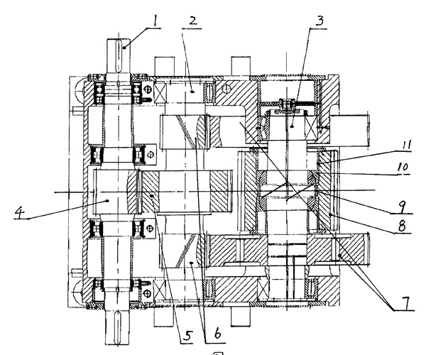 | 本實(shí)用新型提供了一種水泥磨機(jī)用單邊雙傳動(dòng)減速機(jī),主要由第一軸1、第二軸2及第三軸3組成,其特征在于:第一軸1與第三軸3之間有第二軸2,第三軸3有兩個(gè),兩個(gè)第三軸與第二軸2的軸間距相等,第一軸1上的小齒輪4與第二軸2上的大齒輪5為直齒嚙合,第二軸2上的小齒輪6同時(shí)與兩個(gè)第三軸3上的大齒輪7斜齒嚙合,并且同一軸上的兩個(gè)小齒輪6或大齒輪7螺旋方向相反,螺旋角相等,第三軸3的中部設(shè)置有圓柱齒輪8。本實(shí)用新型結(jié)構(gòu)簡(jiǎn)單、緊湊,體積小,并且動(dòng)力傳遞的均載同步性好。 |