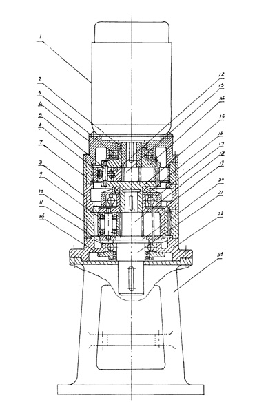 行星齒輪減速機,屬于減速裝置設備領域,具體是化工、發(fā)電、耐火、陶瓷、冶金、礦山及起重運輸等行業(yè)用減速設備。包括電動機(1)、傳動裝置、輸出軸(21)及機座(23),其特征在于:傳動裝置為行星齒輪傳動,電動機(1)位于上方,與行星齒輪傳動裝置相連,傳動裝置與輸出軸(21)相連,輸出軸(21)與下方的機座(23)相連。具有功率大、承載大、使用壽命長、效率高等優(yōu)點。