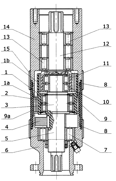 | 一種潛油泵專用減速機(jī),其主要結(jié)構(gòu)特征是雙聯(lián)行星齒輪安裝在輸入軸的偏心軸頸上,其下端的小齒輪與固定齒圈相嚙合,上端的齒圈與輸出軸上的小齒輪相嚙合,輸入軸的下端安裝在下接頭上,上端安裝在輸出軸上,輸出軸則安裝在上接頭上;由于偏心軸頸的作用,使行星齒輪在齒圈內(nèi)作既有公轉(zhuǎn)又有自轉(zhuǎn)的行星運(yùn)動(dòng),并帶動(dòng)輸出軸上的小齒輪轉(zhuǎn)動(dòng),輸出軸即可將該轉(zhuǎn)速輸出。本實(shí)用新型可使用在深度大于1000米的深井中,并能在100℃-200℃的高溫下及10兆帕以上的高壓下穩(wěn)定運(yùn)轉(zhuǎn),其超載能力及耐熱、抗磨損性能均極強(qiáng),結(jié)構(gòu)簡(jiǎn)單緊湊,生產(chǎn)成本較低。 |