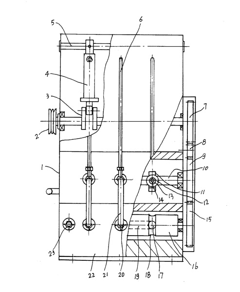 一種液壓減速機,包括一個凸輪分配器,通過油管與對應(yīng)的執(zhí)行部分的油缸連接,使其每一油缸的活塞桿分別與曲軸連接,其特征是在所述凸輪分配器的每一進油閥(12)通過供油管(21)連接轉(zhuǎn)子分配器;該轉(zhuǎn)子分配器上有一連接油泵(6)進油口(23)。