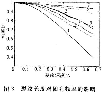 為進一步研究裂紋對構(gòu)件動力學(xué)特性的影響,本文對齒輪齒根裂紋作了更深入的仿真,仿真過程主要針對不同裂紋深度的齒輪展開(深度從小到大,共仿真了14組數(shù)據(jù)),對各齒輪均提取了其前10階固有頻率值。各階固有頻率隨裂紋深度變化的趨勢圖如圖3所示,其中橫坐標代表裂紋深度比(裂紋深度和齒根處齒厚之比);縱坐標為裂紋齒輪和正常齒輪的固有頻率比。為便于觀察,本文僅畫出了前7階固有頻率隨裂紋深度變化的趨勢圖,如圖3所示。