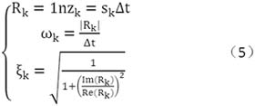 求解得到的根為傳遞函數(shù)的極點,他們與系統(tǒng)的模態(tài)頻率ωk和阻尼比的關(guān)系為: