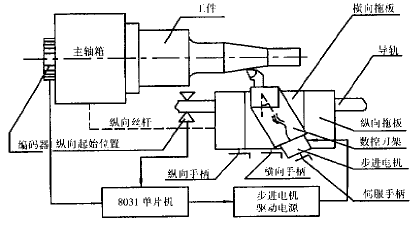 整個(gè)系統(tǒng)由數(shù)控刀架、Inter8031單片機(jī)、步進(jìn)電機(jī)驅(qū)動(dòng)電源、用于拾取主軸信號(hào)的編碼器以及檢測(cè)縱向起始信號(hào)的位置檢測(cè)元件再加上機(jī)床本體組成。系統(tǒng)改裝是在原普通車床的基礎(chǔ)上進(jìn)行的,整個(gè)改裝工作量并不大,只需作以下工作: