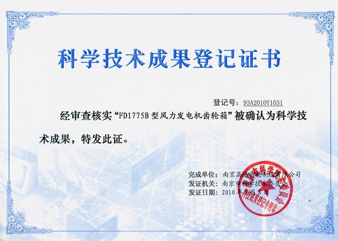 2010年8月26日,在南京高速齒輪制造有限公司(以下簡稱:高速公司)400畝廠區(qū),召開了“ FD1775B、FD2250B型風力發(fā)電機齒輪箱”科技成果鑒定會。會議邀請了南京理工大學、南京航空航天大學、東南大學、南京市江寧區(qū)科技局等單位的專家、領導組成了鑒定委員會。鑒定委員會聽取了高速公司的項目研制工作總結等報告,審查了相關技術文件,考察了生產(chǎn)現(xiàn)場。最終一致認為高速公司研制的兩項產(chǎn)品總體技術水平達到了國際同類產(chǎn)品先進水平,同意通過科技成果鑒定,并希望進一步擴大國內(nèi)外市場。