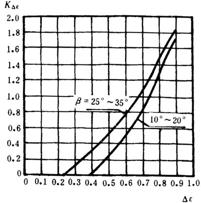 接觸跡系數(shù)是考慮重合度尾數(shù)Δε對輪齒應(yīng)力的影響系數(shù)。當(dāng)Δε較大時,在相應(yīng)于Δε的齒寬部分,即使在最不利的情況下,也有部分接觸跡參與承擔(dān)載荷,使輪齒應(yīng)力有所下降。推薦Δε=(0.25~0.4)。KΔε值可按Δε由圖3查取。當(dāng)齒端修薄時,應(yīng)根據(jù)減去齒端修薄長度后的有效齒長部分的Δε來查圖(當(dāng)20°<β°<25°時,采用插值法查取)。