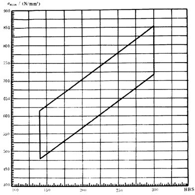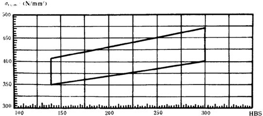 疲勞極限是指某種材料的齒輪經(jīng)長期持續(xù)的重復(fù)載荷(接觸應(yīng)力循環(huán)基數(shù)No=5×107,彎曲應(yīng)力循環(huán)基數(shù)No=3×106)作用后,輪齒保持不破壞時的極限應(yīng)力。它可由齒輪的負(fù)荷動轉(zhuǎn)試驗或經(jīng)驗統(tǒng)計數(shù)據(jù)獲得。當(dāng)缺乏資料時,可參考圖10和圖11,根據(jù)材料和齒面硬度取值。鑄鋼、氮化鋼和球墨鑄鐵的疲勞極限見附錄A(補(bǔ)充件)。