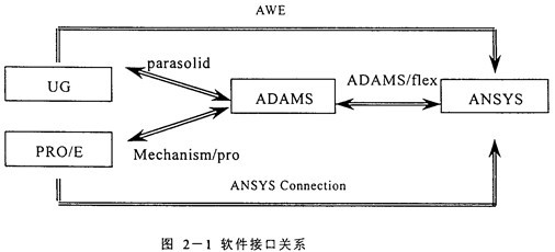以上四個軟件均是當今比較流行且功能強大的大型CAD/CAE軟件,然而考慮到ADAMS的內(nèi)核就是Parasolid,從UG中導入ADAMS的模型包含了在UG里定義的密度、質(zhì)量等幾何屬性,不需作任何變更就可使用;而PRO/E與ADAMS間通過Mechanism/pro模塊進行連接時存在較多的問題,經(jīng)過長時間的摸索才連通,且發(fā)現(xiàn)在PRO/E里南非先將各個零件定義為剛體,作為子裝配只能定義為一個剛體,可是像RV減速器這樣的大模型在裝配過程中不可避免地含有子裝配并且子裝配中的零件間有相對運動,將其定義為一個剛體是錯誤的,為此,本課題中采用了UG、ADAMS與ANSYS形成的分析平臺。