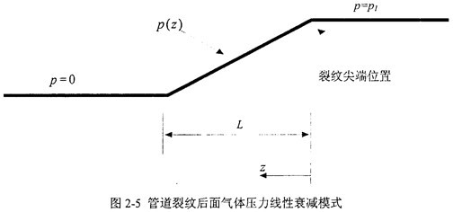 1.3.3節(jié)提到了解禍算法中氣體壓力模式的廣泛應(yīng)用。對于含裂紋擴(kuò)展的管道,其內(nèi)部管壁受到的氣體壓力由兩種模式組成:裂紋前面氣體減壓傳播和裂紋后部的氣體壓力衰減。