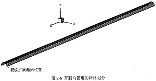 管道上的裂紋一般從起裂點(diǎn)同時(shí)向兩側(cè)擴(kuò)展。因管道幾何形狀和載荷分布具有對稱性,本文取一側(cè)管道的一半來分析和計(jì)算,即四分之一模型,如圖2-6所示。采用四節(jié)點(diǎn)板殼單元,沿管道軸向和環(huán)向分別劃分網(wǎng)格,在管道內(nèi)壁給出氣體壓力分布。
