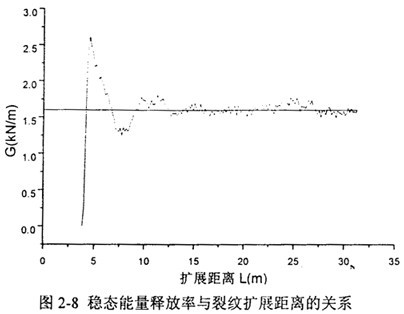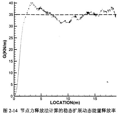 如圖2-8,隨著裂紋起裂后的迅速擴(kuò)展,裂紋驅(qū)動力上升直至達(dá)到并保持在穩(wěn)定的數(shù)值,這一平臺值1.6KN/m就是裂紋穩(wěn)態(tài)(steady state)擴(kuò)展的驅(qū)動力G。裂紋尖端的移動過程中,G在該值附近有一些小的波動,這是由于裂紋長度的突然增加和位移約束的突然解除,引起的有限元解的高頻振蕩。振蕩的幅度與有限元單元網(wǎng)格的疏密和單元內(nèi)節(jié)點(diǎn)力釋放的指定規(guī)律有關(guān)。