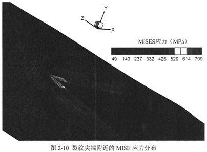 首先觀察裂尖附近的MISES應(yīng)力分布,如圖2-10。按以針狀鐵素體和塊狀鐵素體組織為主的X70鋼級管線鋼的平均屈服強(qiáng)度500~600MPa估算,計(jì)算給出的裂尖前部塑性區(qū)長度大約在3個單元長度以內(nèi),即0.15m左右。
