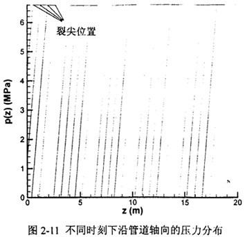 圖2-11直觀地給出了內(nèi)壓10MPa,裂紋速度216m/s時(shí)一維管道氣體壓力模型(L=1.5D)下的管壁壓力沿軸向的分布。每條曲線的衰減起始點(diǎn)即為該時(shí)刻的裂尖位置。圖中裂尖壓力約為6.6MPa。