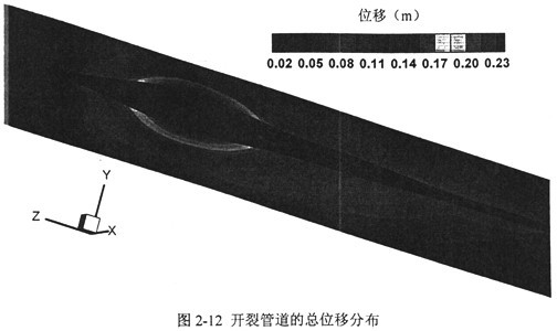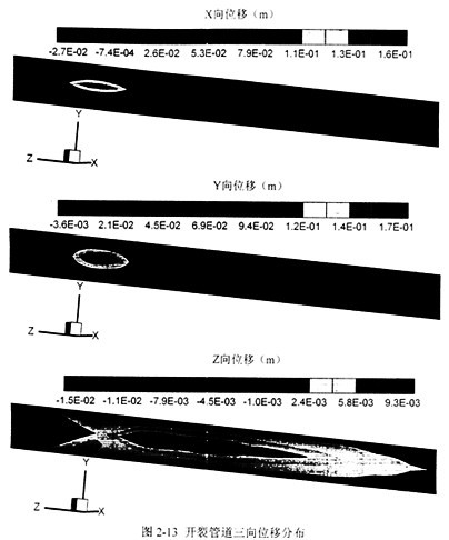 圖2-13分別按照三個方向上的位移分布在開裂前管道表面畫出云紋圖。從圖中可以看到,此種設(shè)計(jì)參數(shù)下的位移量主要發(fā)生在裂尖附近5m左右的區(qū)域,對遠(yuǎn)端的影響較小。